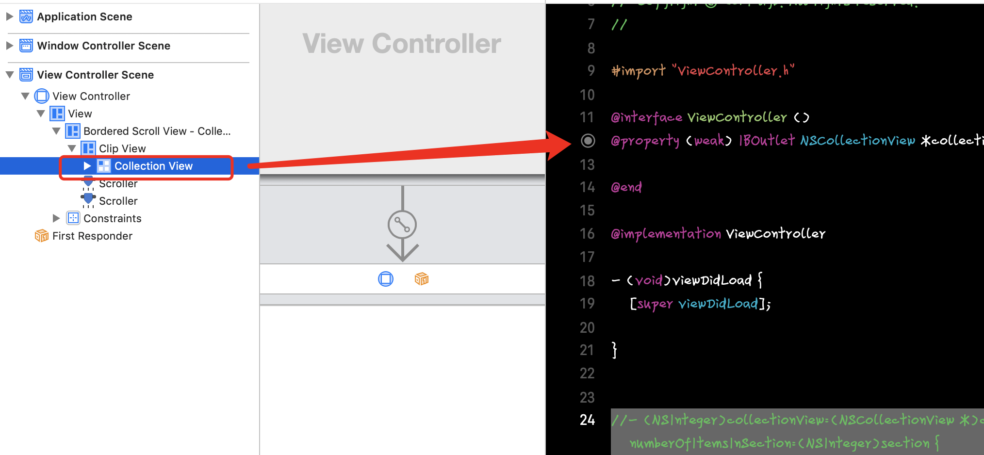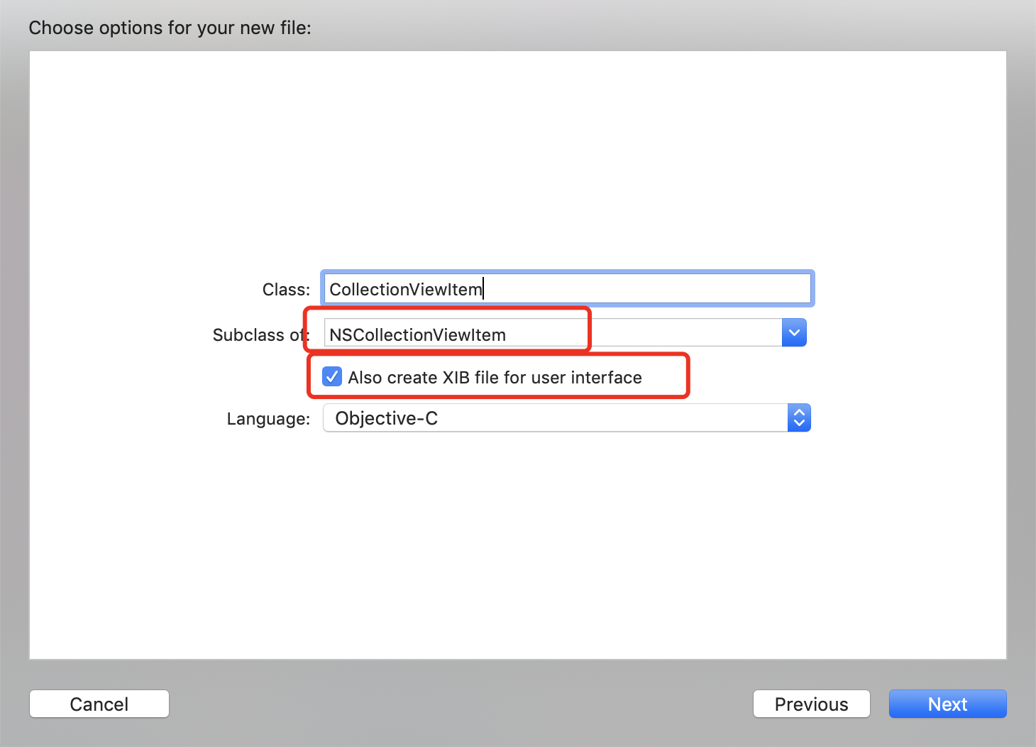 | - (void)viewDidLoad { [super viewDidLoad]; self.collectionView.dataSource = self; [self.collectionView registerClass:[CollectionViewItem class] forItemWithIdentifier:@"item"]; }